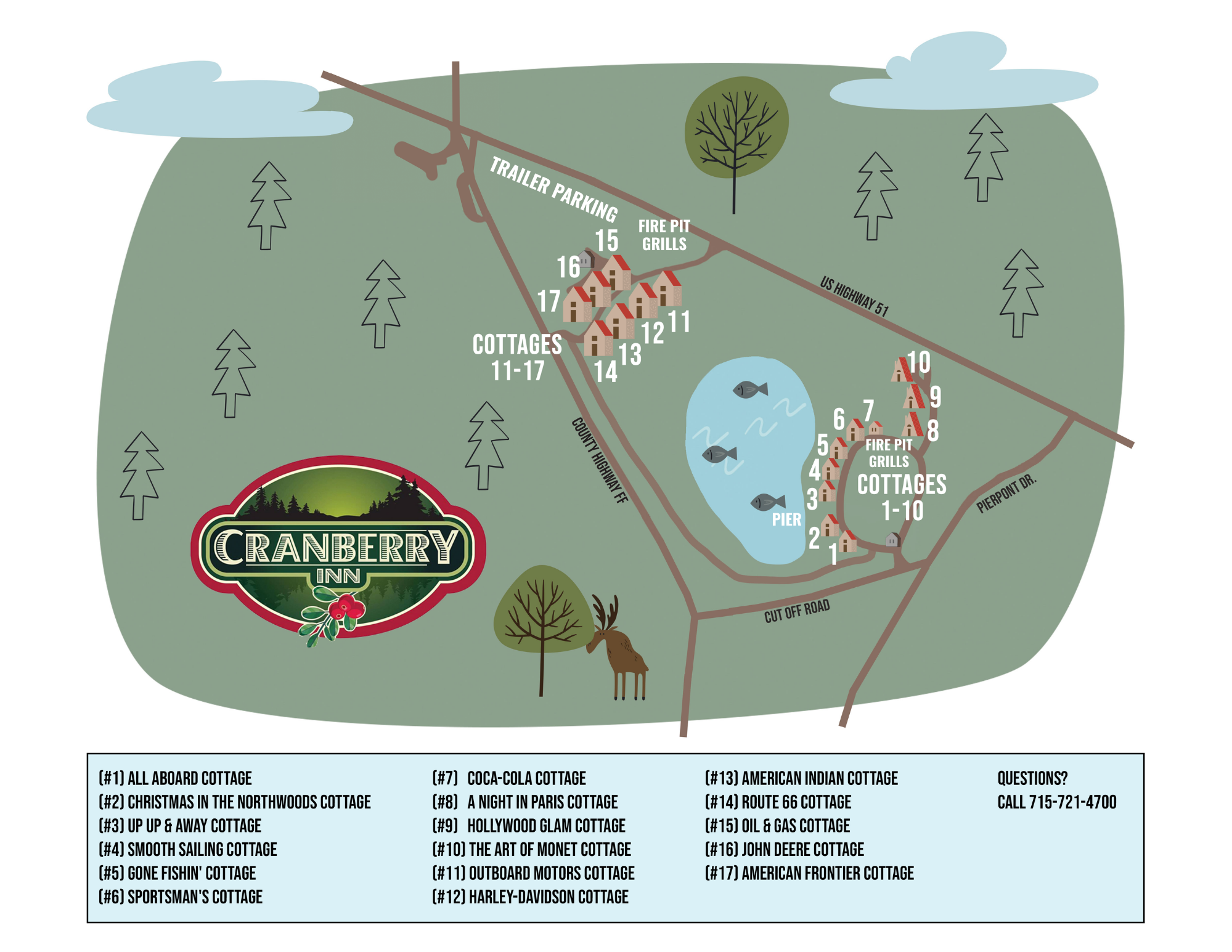 If you're staying in Cottages 1-10, turn right on Pierpont Drive, approximately 1/2 mile past County Road FF. Then turn right on Cut Off Road, and an immediate right into our property.